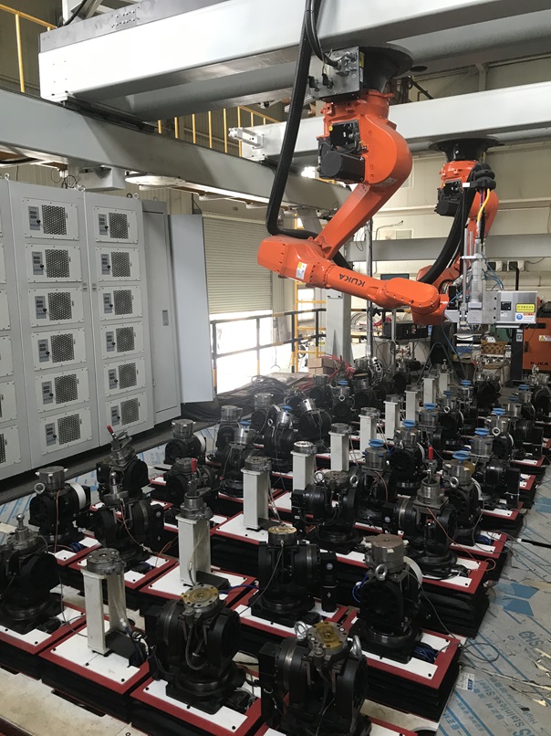 柔性成型设备按照工艺流程的要求,用安装在工作平台上的几十个夹持组件,随工艺流程对平面铝合金试验板输入的脉冲电流,配合做不同方向的移动、旋转和俯仰动作,使实验板变形成为符合技术要求的异形板。