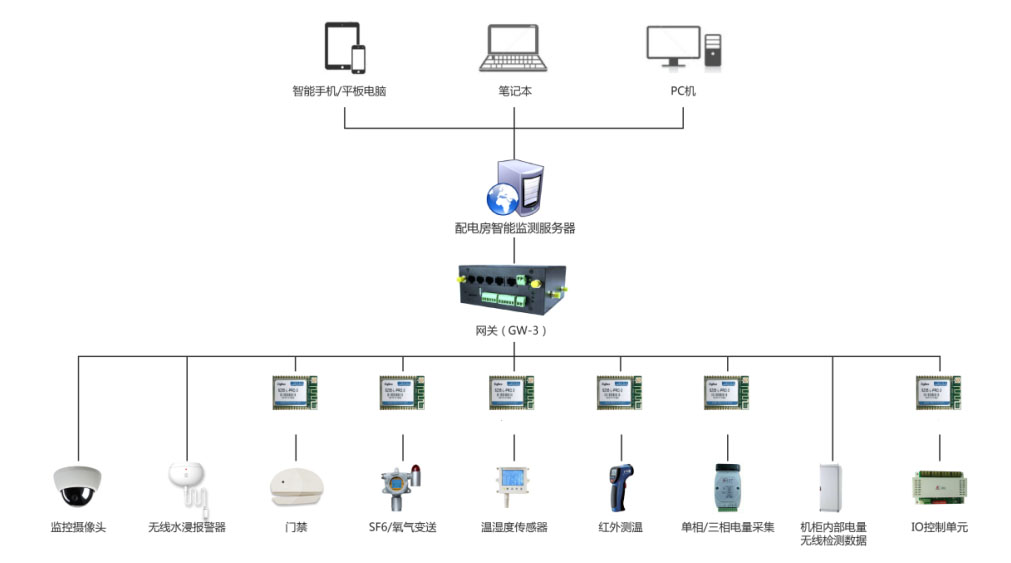 - 在机房各区域安装无线烟雾传感器,对火情进行采集并上传至中心。